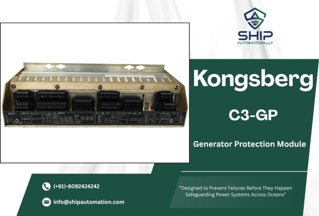 The KONGSBERG C3-GP Generator Protection Module is a dedicated generator protection unit used in Kongsberg marine automation and power management systems. It monitors voltage, current, frequency, and load conditions in real time and automatically trips the generator circuit breaker during electrical faults such as overload, reverse power, short circuit, or abnormal frequency. Operating independently from other automation units, it ensures continuous generator safety, reliable power distribution, and blackout prevention in modern vessel electrical systems.